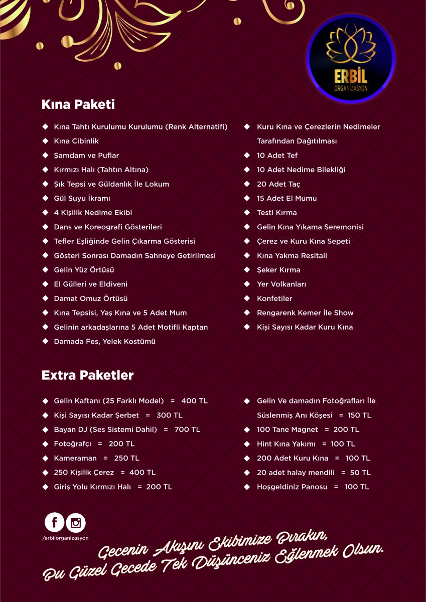 Erbil organizasyon ekibi olarak sana bütün kına organizasyonunu anlatmaya çalıştık. Şimdi sıra sende. Bize ulaş ve senin de geceni planlayalım.